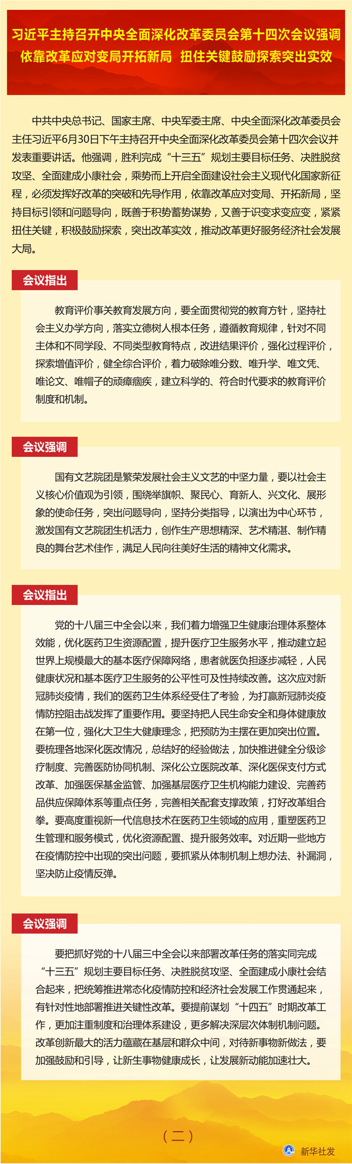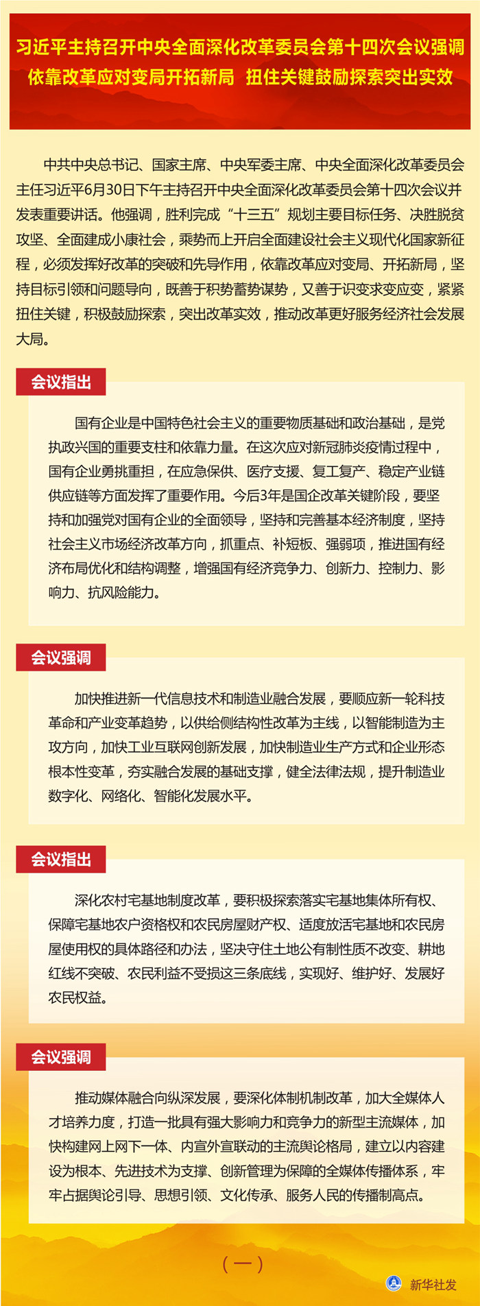 新华社北京630日电  中共中央总书记、国家主席、中央军委主席、中央全面深化改革委员会主任习近平630日下午主持召开中央全面深化改革委员会第十四次会议并发表重要讲话。他强调,胜利完成十三五规划主要目标任务、决胜脱贫攻坚、全面建成小康社会,乘势而上开启全面建设社会主义现代化国家新征程,必须发挥好改革的突破和先导作用,依靠改革应对变局、开拓新局,坚持目标引领和问题导向,既善于积势蓄势谋势,又善于识变求变应变,紧紧扭住关键,积极鼓励探索,突出改革实效,推动改革更好服务经济社会发展大局。