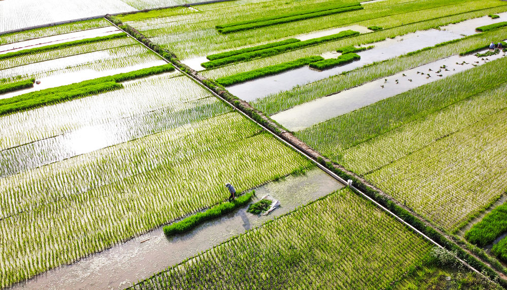 2020614日,农民在洛阳市孟津县会盟镇黄河岸边的万亩优质水稻种植示范基地内移栽水稻秧苗(无人机照片)。新华社发(黄政伟 摄)