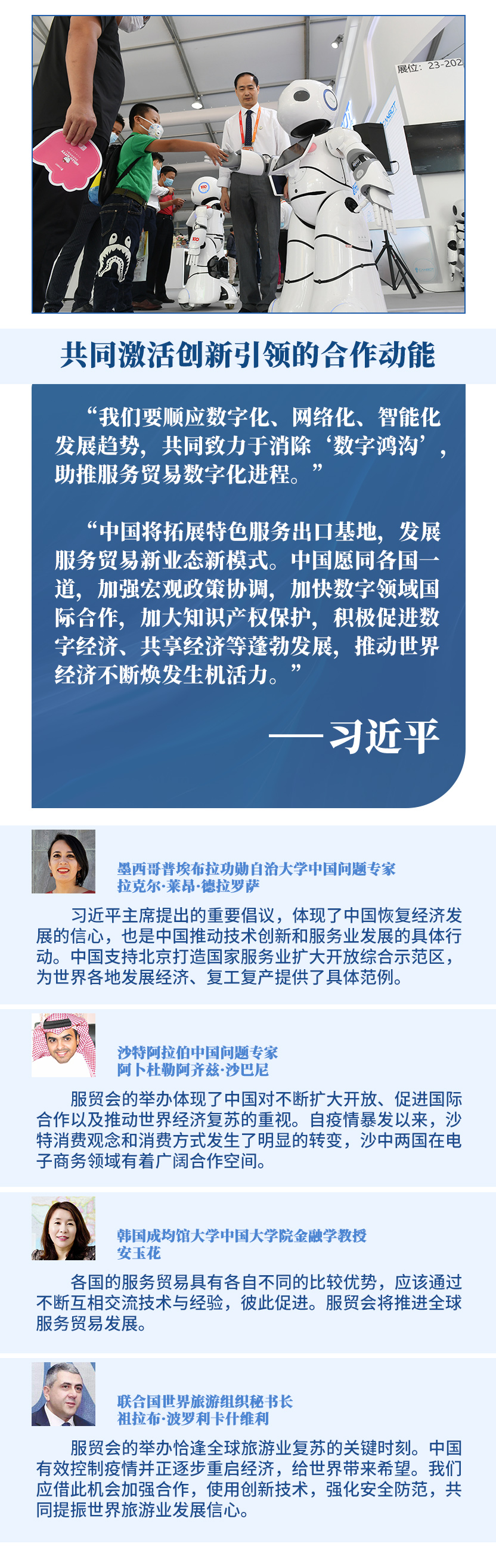 在全球范围新冠疫情尚未得到全面控制、经济全球化遭遇逆流的背景下,习主席就促进全球服务业开放合作提出3点倡议,为推动世界经济尽快复苏注入信心和动力,向国际社会展现中国负责任大国的作为和担当。