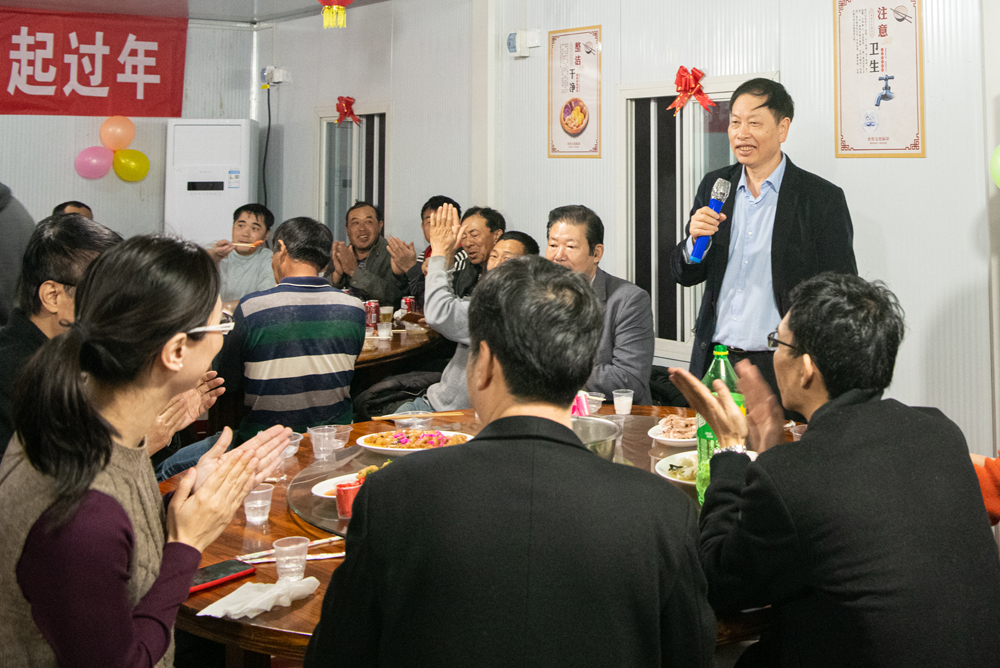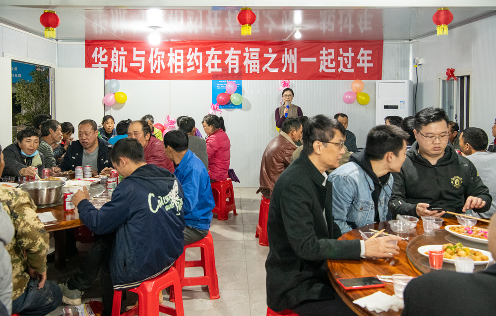 华灯初上,夜幕降临,华航集团董事长、党支部书记张华官,陈益魁总经理等领导和党员同志们来到项目部年夜饭现场,与一线建设者们共同欢度节日。在彩花、汽球妆点下的年夜饭现场,不时传出阵阵欢声笑语。张华官书记邀请大家共同举杯,他说,你们积极响应国家号召,主动放弃与家人团聚的机会,为疫情防控和增产增效贡献自己的力量,这样的付出让人感动也值得珍视,企业会扎实做好各方面保障,让你们在福州度过一个美好的春节。