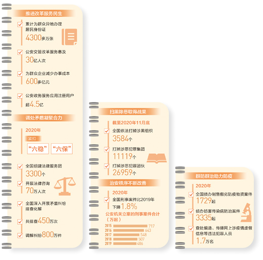依法严惩违法犯罪,不断夯实平安中国之基。近年来,从深入开展“昆仑”行动守护“舌尖上的安全”,到持续部署“净网”行动构建清朗网络空间,从集中打击整治跨境赌博、长江流域非法捕捞、涉枪爆、涉文物、涉野生动物等违法犯罪,到持续打击电信网络诈骗、非法集资、侵犯知识产权等违法犯罪,一系列重拳出击有效净化了社会治安环境。2020年,全国刑事案件比2019年下降1.8%8类主要刑事案件同比下降8.7%,立现行命案数同比下降9.3%,治安案件同比下降10.4%