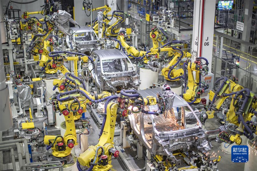 在重庆金康新能源汽车有限公司,智能化焊接机器人在进行焊接作业(2021年4月2日摄)。新华社记者 黄伟 摄
