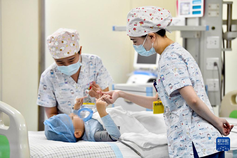 在山东省枣庄市妇幼保健院儿童ICU病房,医护人员为完成靶向治疗药物诺西那生钠的4岁脊髓性肌萎缩症患儿加油鼓劲(11日摄)。诺西那生钠注射液是我国首个获批治疗脊髓性肌萎缩症的进口药物,2019年进入中国市场时,每针价格近70万元。在2021年国家医保目录药品谈判中,以3.3万元每针的价格进入新版医保药品目录。新华社记者 郭绪雷 摄
