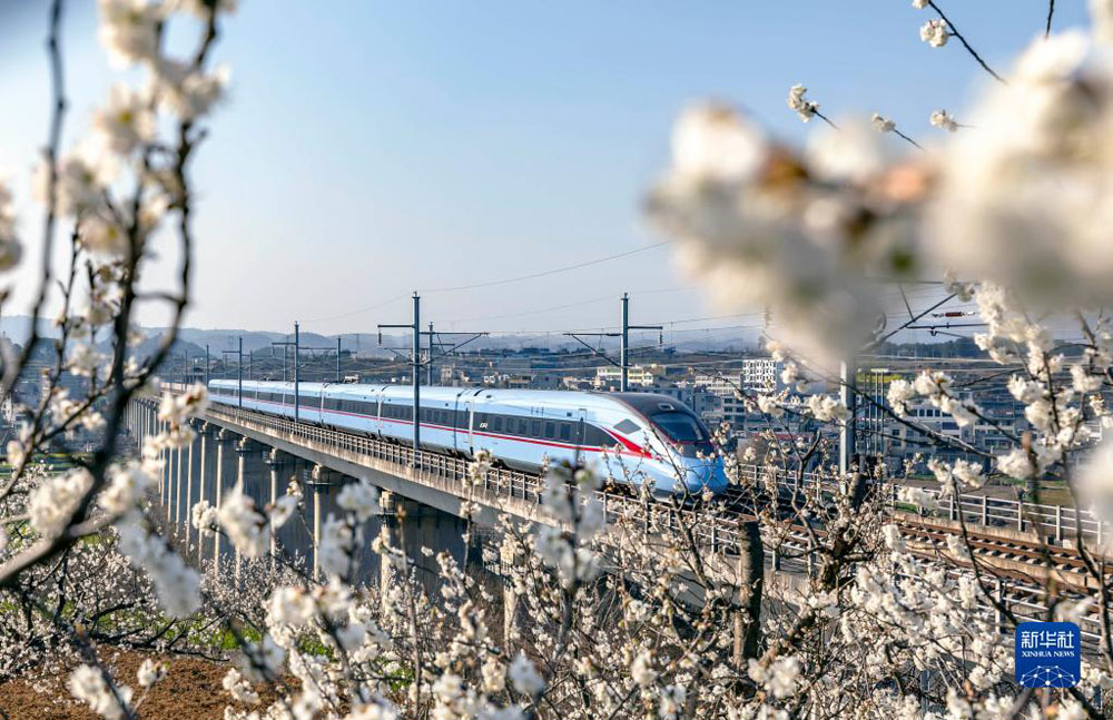 动车组列车在成贵高铁贵州黔西段行驶(202237日摄)。 新华社发(范晖 摄)