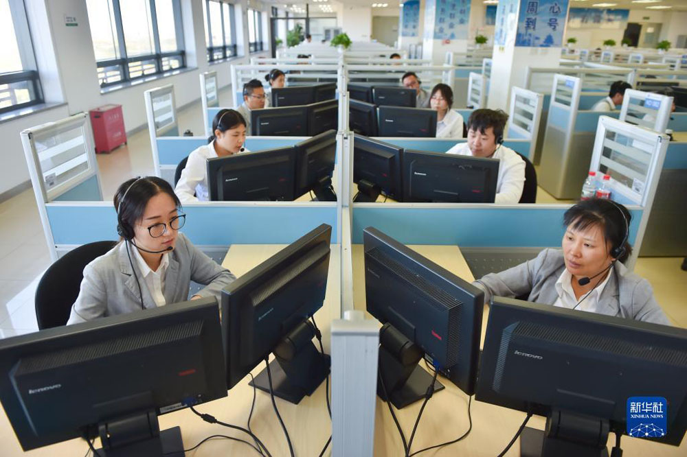 在位于北京亦庄的12345市民热线话务大厅,工作人员接听热线电话(20191113日摄)。 新华社记者 彭子洋 摄