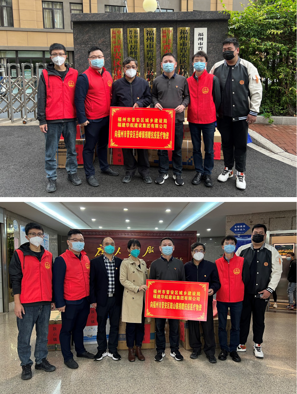 在晋安区城乡建设局的组织下,福建华航建设集团总经理阮伏球带领公司部分管理人员和党员志愿者,分别来到晋安区岳峰镇人民政府和鼓山镇人民政府,向抗疫一线捐赠一批包含N95口罩、防护服、隔离衣、免手洗皮肤消毒液,医用外科手套,医用隔离衣防护面屏等在内的医疗物资,并向奋战在一线的“防护白”“制服蓝”“志愿红”表达感谢和敬意。