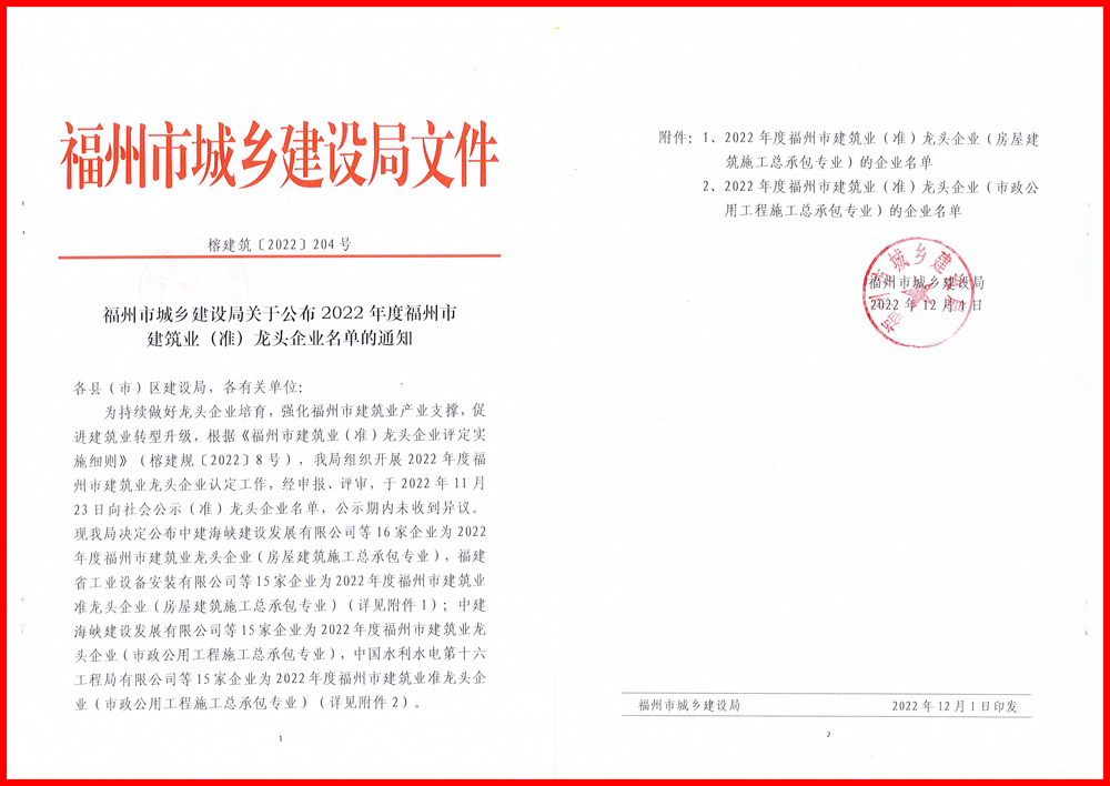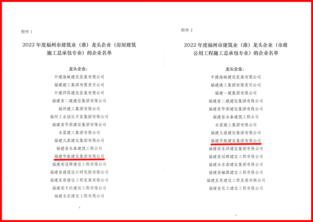 福建华航建设集团再次荣膺福州市建筑业龙头企业(房屋建筑施工总承包专业、市政公用工程施工总承包专业)